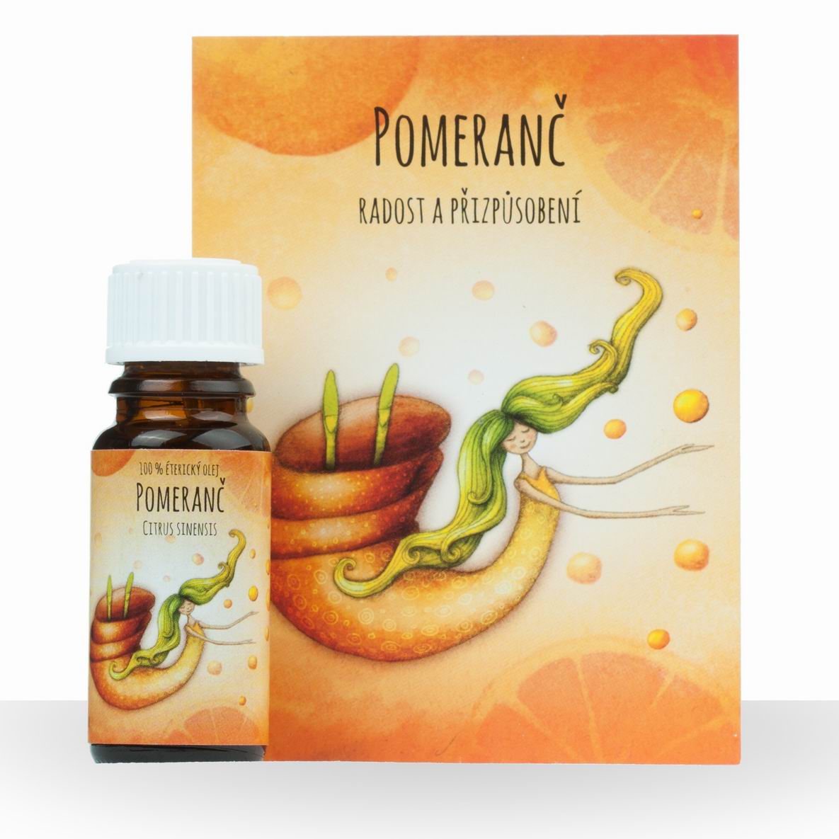 Teplé, slunečné a sladké aroma pomeranče navozuje radost a pozitivní pocit, rozptyluje smutnou náladu a popudlivost. Olej je zvlášť vhodný pro jedince usilující o dokonalost a úspěch, příliš usilovně se snažící, neschopní požádat o radu či pomoc. Pomerančová esence napomáhá uvolněnějšímu přístupu, podněcuje přizpůsobivost a usnadňuje řešení problémů.
